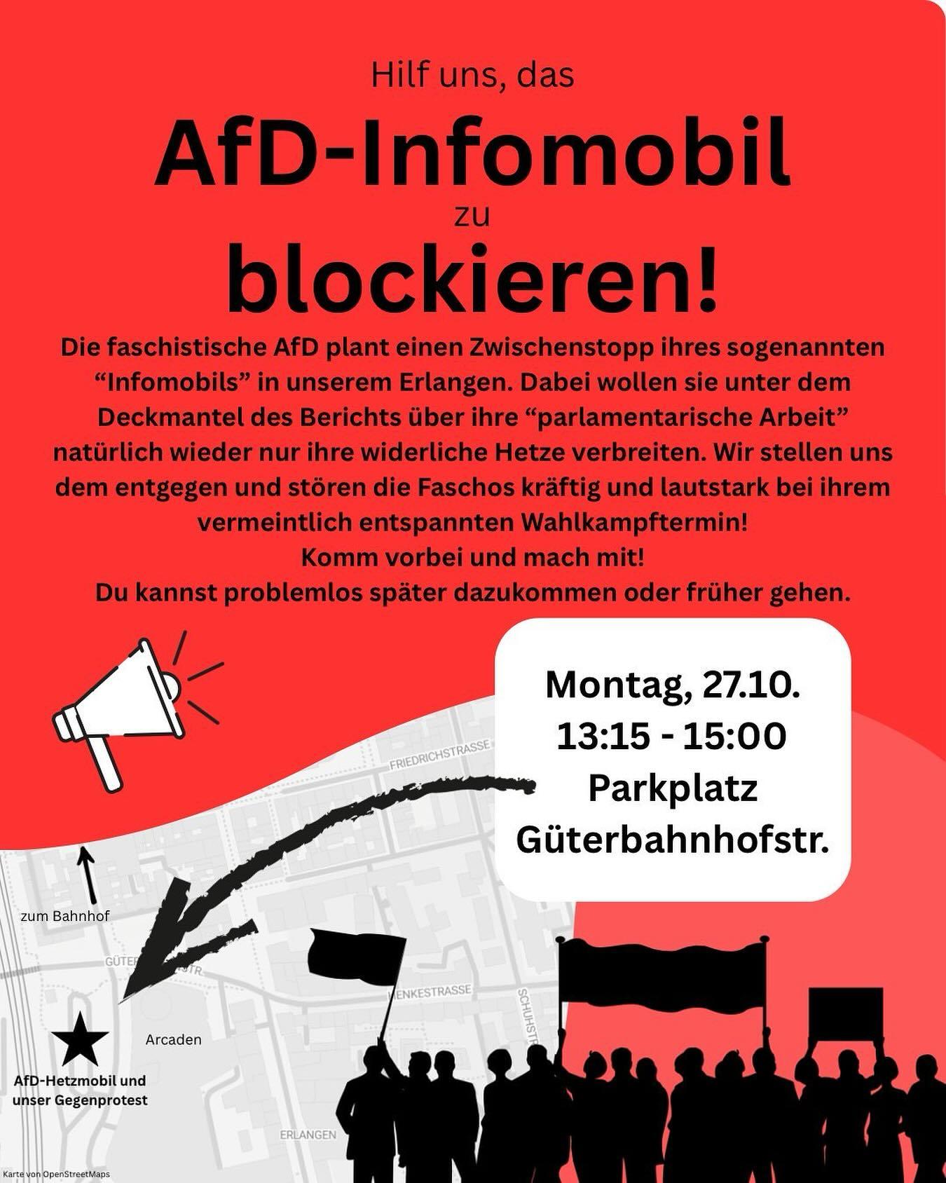 Am Montag, 27. Oktober fährt die AfD in Erlangen vor, mit ihrem sogenannten Infomobil. Sie wollen hier ihre Propaganda unter die Leute bringen und wir wollen das verhindern.