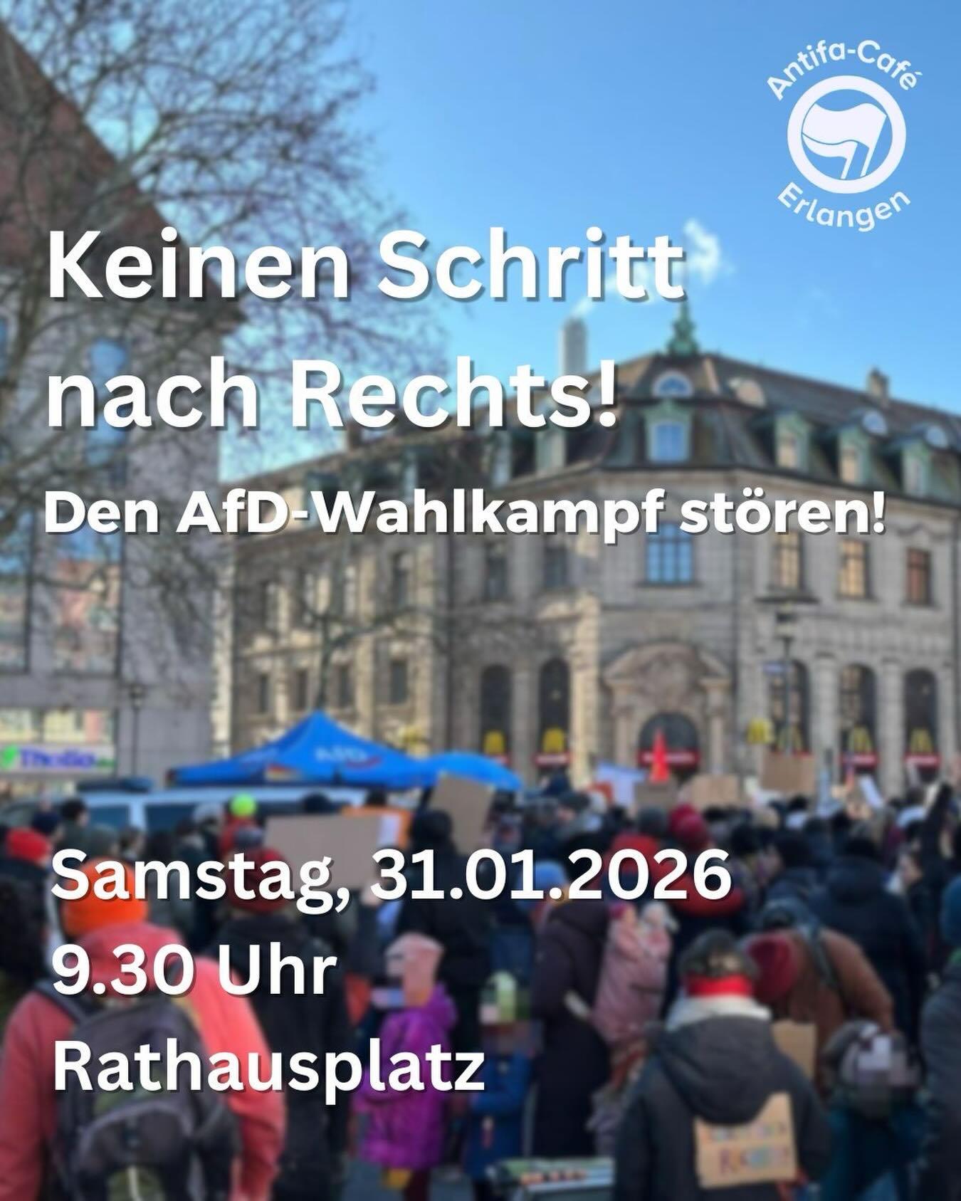 Die Kommunalwahlen in Bayern stehen an, und auch dieses Mal ist die „Alternative für Deutschland“ vertreten. Mit menschenverachtender, rassistischer und queerfeindlicher Politik versuchen sie Stimmen für sich, für das Kapital und gegen uns Arbeiter*innen zu gewinnen. Am Samstag den 31.01.2026 stellen wir uns dem entgegen!